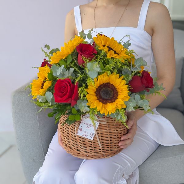 CANASTILLA DE GIRASOLES Y ROSAS ROJAS.