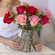 JARRÓN DE 10 ROSAS DE COLOR ROJO Y ROSADAS.
