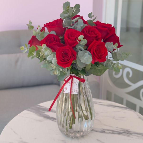 JARRÓN DE VIDRIO DE DOCE ROSAS ROJAS.