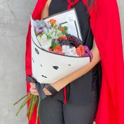 RAMO DE FLORES VARIADAS NEGRAS, NARANJAS Y LILAS ENVUELTO EN PAPEL ESPECIAL HALLOWEEN.