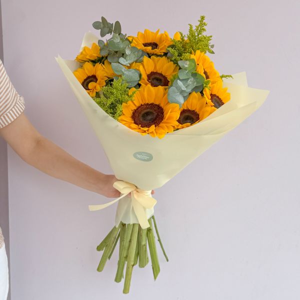 RAMO DE 10 GIRASOLES ENVUELTO EN PAPEL ESPECIAL AMARILLO.