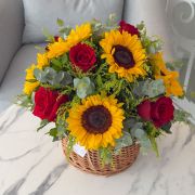 CANASTILLA DE GIRASOLES Y ROSAS ROJAS.