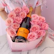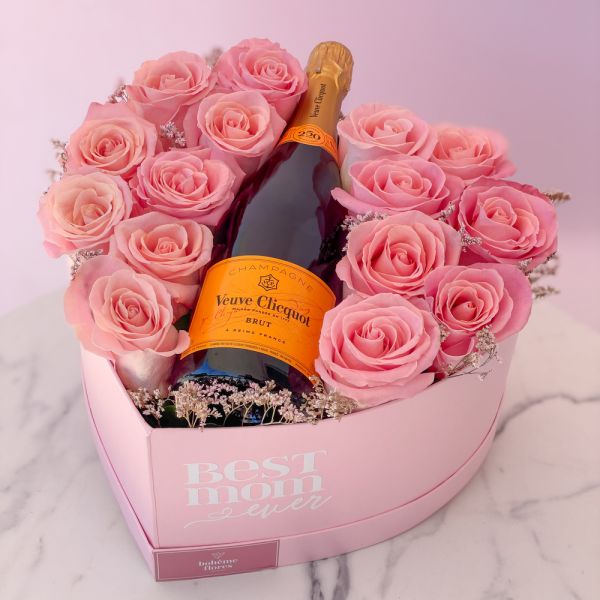 UN BOX DE CORAZÓN CON ROSAS Y UN CHAMPAGNE DE VEUVE CLICQUOT DE 750ML