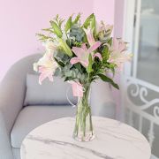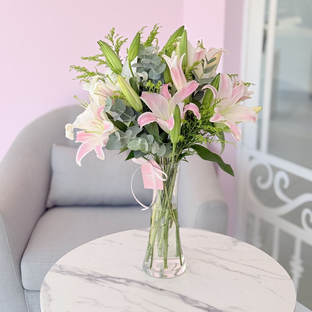 JARRÓN DE VIDRIO CON 6 LIRIOS.