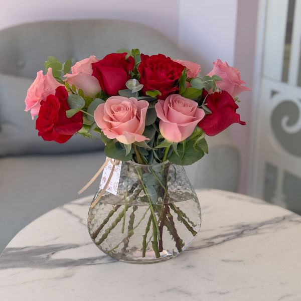 JARRÓN DE 10 ROSAS DE COLOR ROJO Y ROSADAS.