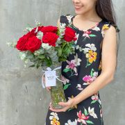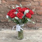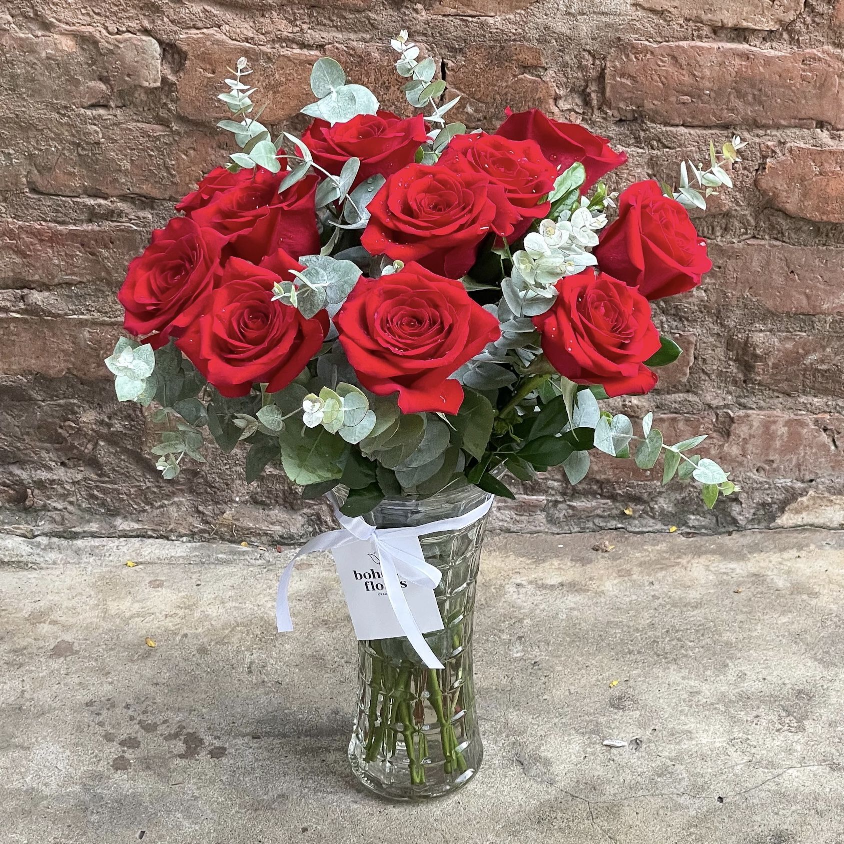 JARRÓN DE VIDRIO CON UNA DOCENA ROSAS ROJAS