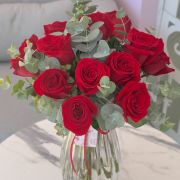 JARRÓN DE VIDRIO DE DOCE ROSAS ROJAS.