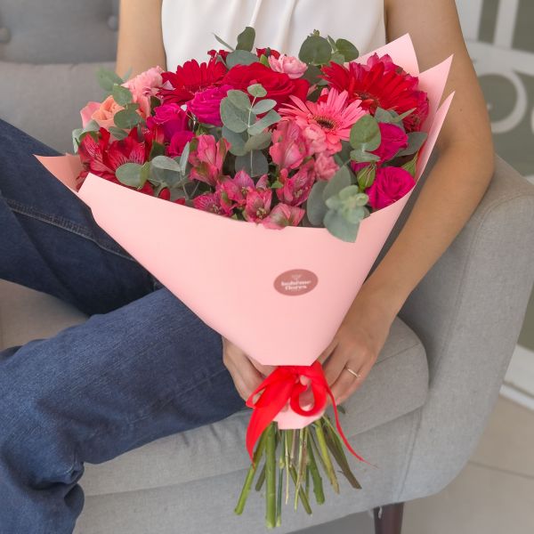 RAMO UNA DOCENA DE 13 FLORES ROSADAS Y ROJAS.