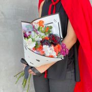 RAMO DE FLORES VARIADAS NEGRAS, NARANJAS Y LILAS ENVUELTO EN PAPEL ESPECIAL HALLOWEEN.