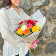 RAMO DE ONCE ROSAS COLORIDAS ENVUELTO EN PAPELES ESPECIALES.