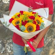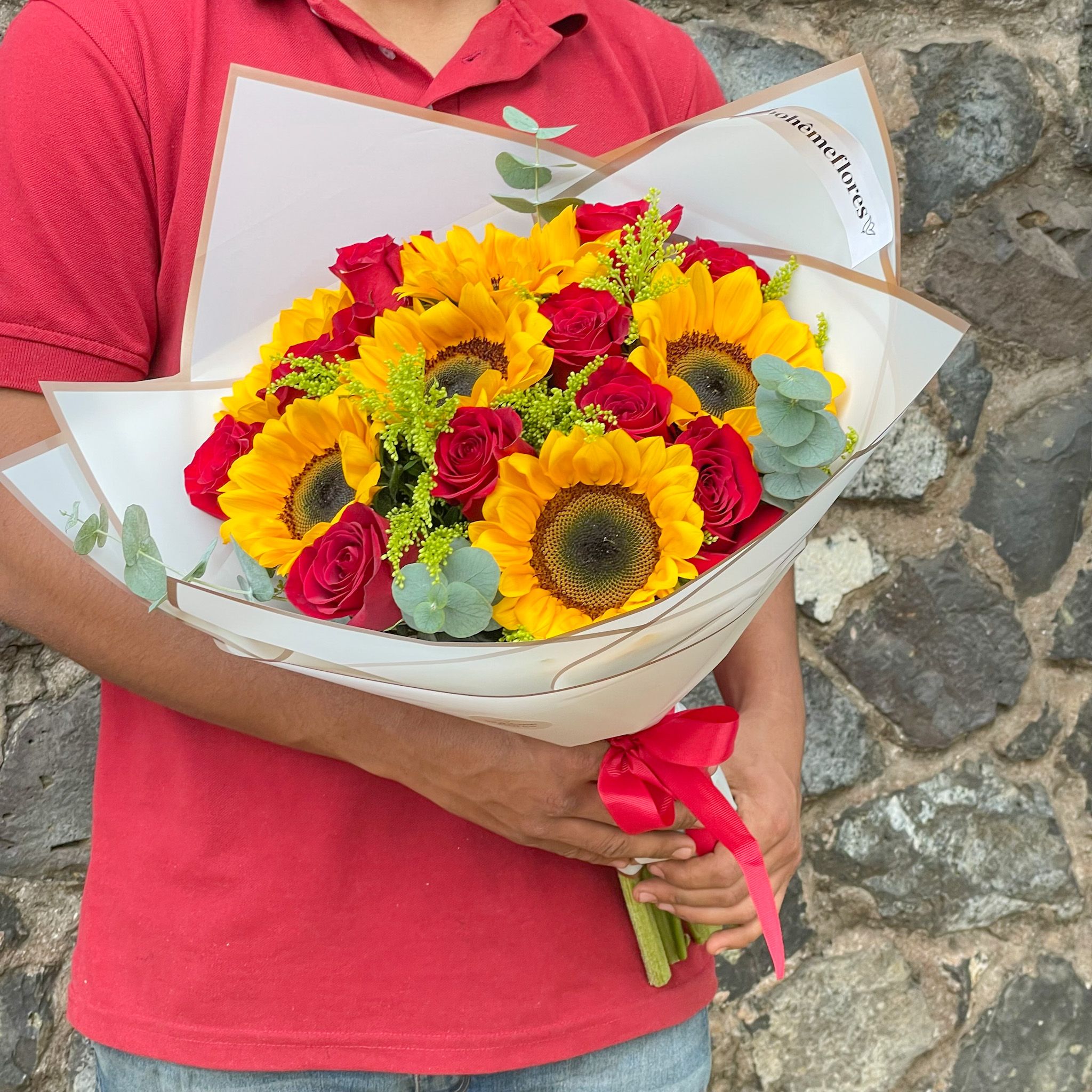 UN RAMO DE UNA DOCENA DE ROSAS Y MEDIA DOCENA DE GIRASOLES ENVUELTO EN PAPEL ESPECIAL.