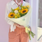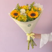 RAMO DE FLORES VARIADAS TONOS AMARILLO Y BLANCO ENVUELTO EN PAPEL ESPECIAL.